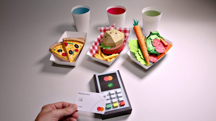 We love it when we get to make a load of fun paper props and on this project we were given the freedom to let loose and make some fun food (that ice-cream!), a cinema set and a beautiful bunch of flowers! We’re particularly fond of the the lovers montage between the Mastercard and POS machine – if only machines worked this way in real life!